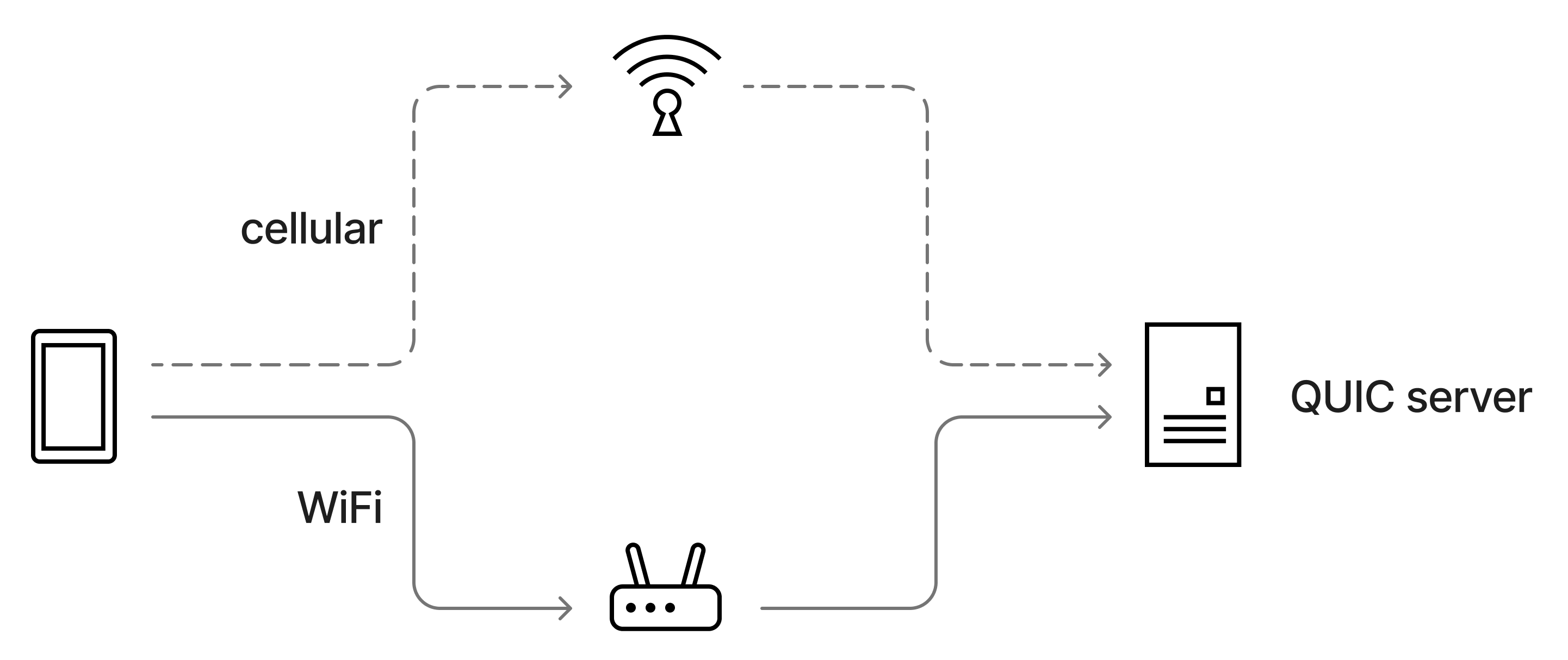 In contrast to TCP, where a connection is identified by the 4-tuple (i.e. the IP:port of both client and server), a QUIC connection can switch to a new 4-tuple over its lifetime. For example, this allows a connection to start on WiFi, and then be migrated to a cellular connection when the user moves away from the WiFi access point. Note that while QUIC supports migrating a connection from one path to the other, at any point in time only a single path is in use to send application data.